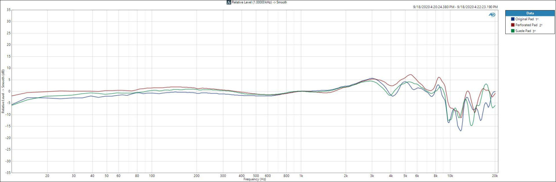 The original earpad is the blue line, suede is green, and perforated is red.