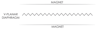 We collaborated with Bruce Thigpen of Eminent Technology to develop V-Planar knurling. This technology deeply creases the diaphragm, allowing the flexibility required to fit larger motions for a deeper, truer musicality and a larger percentage of the driver moving as a flat surface rather than a parabola, which moves more air and allows a smaller driver to perform like a larger driving, reducing size and weight. The V-Planar driver allows expansion and contraction of sound without losing fidelity or stretching it too thin as illustrated in Figure 2, and has the additional benefit of reducing standing wave modalities on the driver diaphragm.