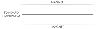 All of our ETHER and ÆON headphones utilize our patented (US patent 9,854,364) V-Planar™ technology. A conventional planar driver is assumed to move as a flat surface. In reality, this is not possible as the driver is inelastic and “locked” at the boundaries so the driver moves more as a bowed surface than a flat plane, as illustrated in Figure 1. Because the surface movement is non-linear maximum excursion occurs only at the center of the diaphragm, but V-Planar technology changes this.